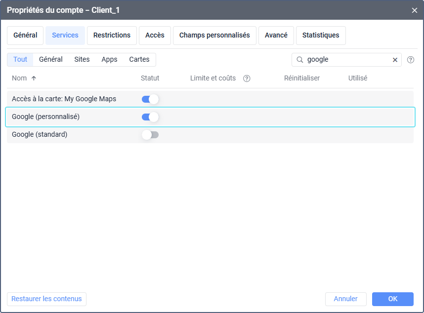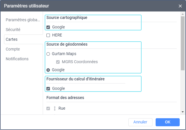 Pour les cartes Google, activez Google (personnalisé) ou Google (standard).