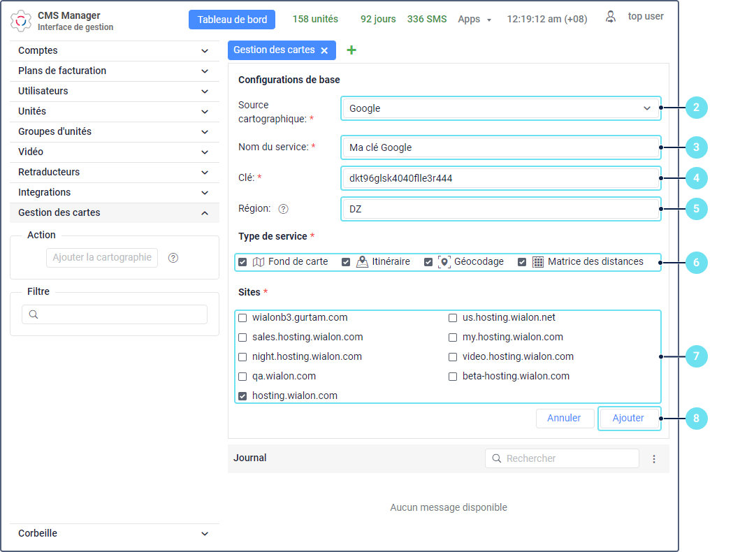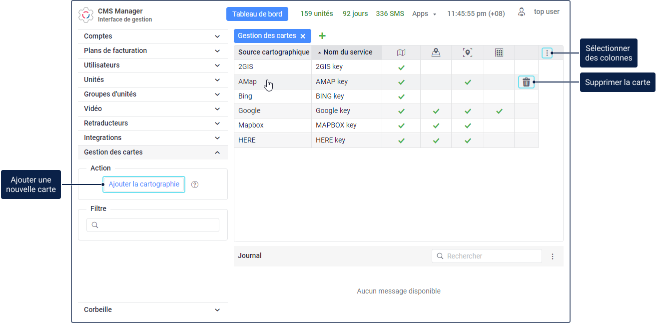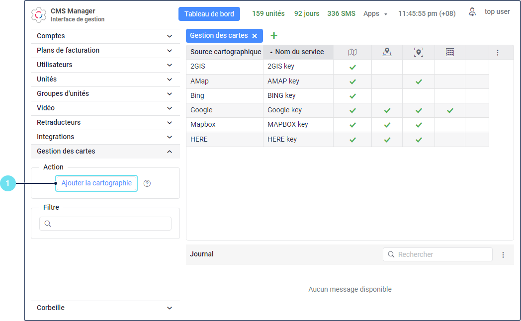 La section Gestion des cartes est disponible uniquement dans le système de gestion CMS Manager et pour les comptes de niveau supérieur. Dans cette section, vous pouvez ajouter, modifier et supprimer des cartes. Un tableau standard contient toutes les cartes ajoutées qui peuvent être utilisées comme fonds de carte, source de calcul de l’itinéraire, source de géodonnées et matrice de distance. Les services disponibles de la carte sont signalés par l’icône