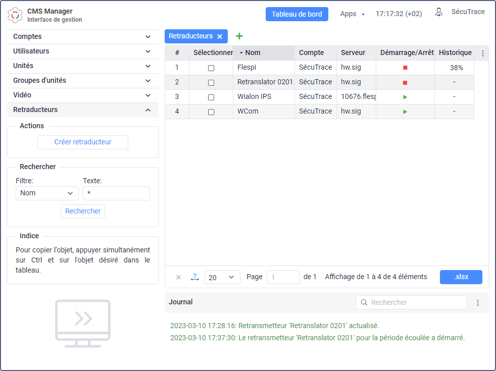 Les retransmetteurs permettent de transmettre des messages d’unités depuis votre serveur vers d’autres serveurs ou systèmes en temps réel ou pour une période passée. Avec les retransmetteurs, les données peuvent être transmises simultanément à plusieurs serveurs utilisant différents protocoles.