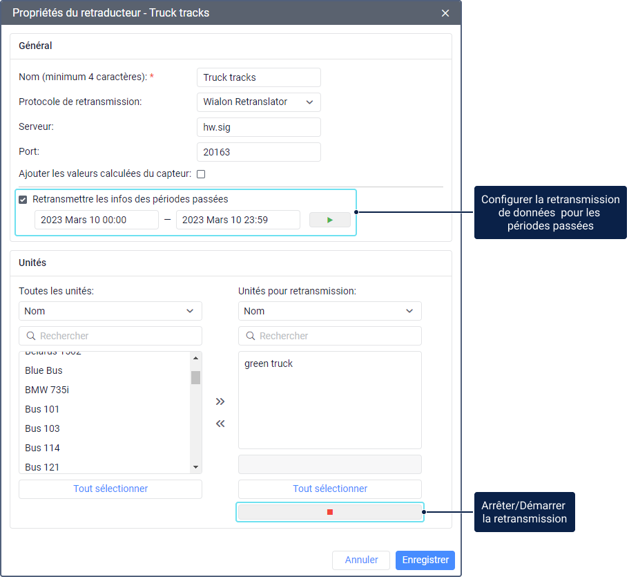 Les messages des unités ne sont transmis que lorsque le retransmetteur est démarré. Par défaut, les données sont transmises en temps réel. Si la transmission a été suspendue, les messages accumulés pendant ce temps ne sont pas transmis. Pour les transmettre, utilisez l’option Retransmettre les infos des périodes passées.