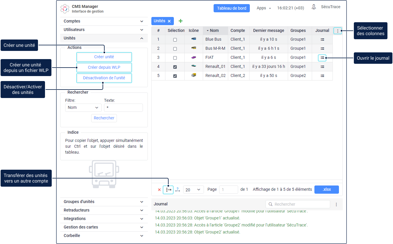 La section permet d’effectuer diverses actions avec des unités : créer, désactiver, transférer d’un compte à un autre, etc.