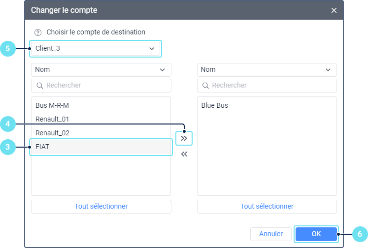 Dans la liste à gauche, sélectionnez les unités que vous souhaitez transférer à un autre compte. Pour trouver l’unité nécessaire, vous pouvez utiliser le filtre dynamique au-dessus de la liste.