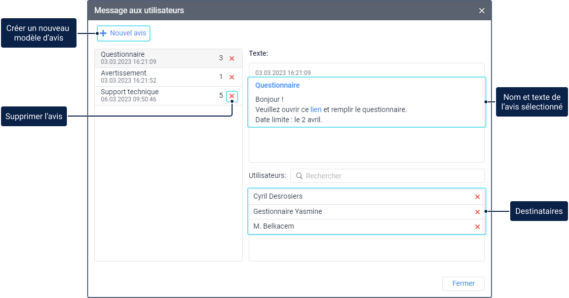 Pour annuler l’envoi de l’avis à l’un de ses destinataires, cliquez sur l’icône