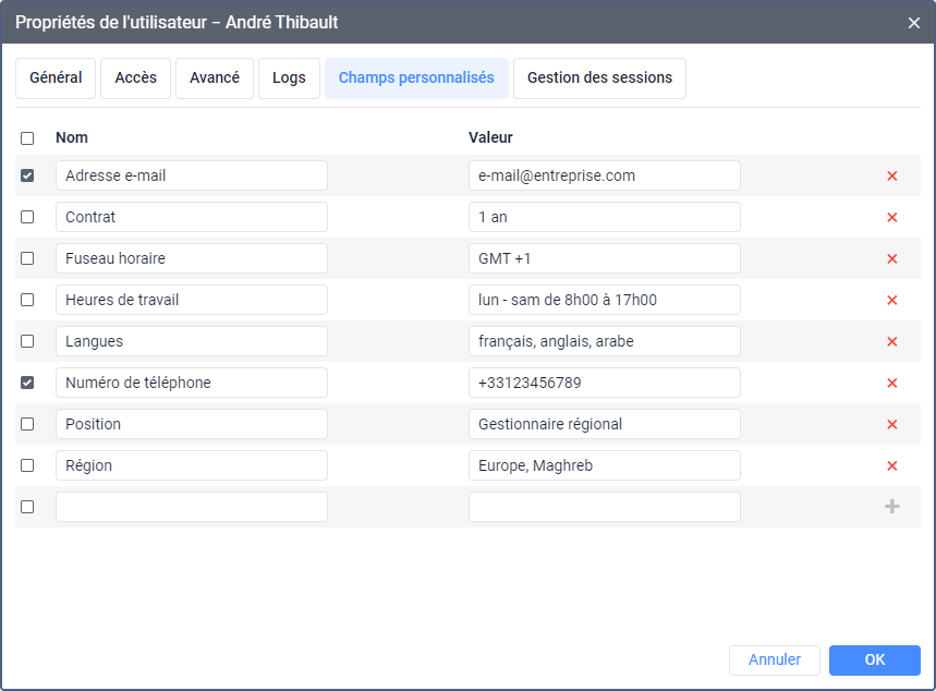 Dans cet onglet, vous pouvez créer des champs personnalisés avec des informations supplémentaires sur l’utilisateur.