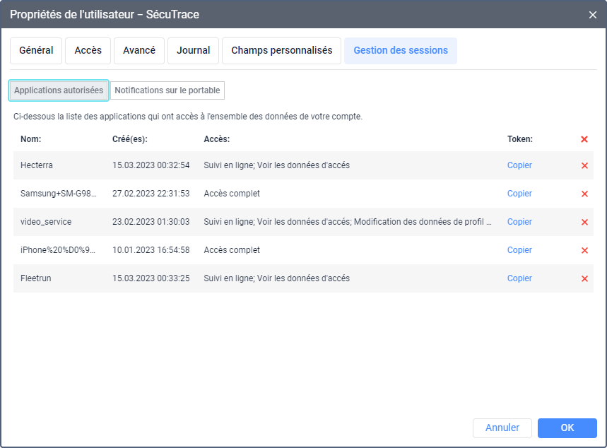 Cet onglet affiche la liste des applications qui ont accès aux données du compte de l’utilisateur. Si l’utilisateur se connecte à l’application à partir d’un appareil portable, le nom de l’appareil s’affiche au lieu du nom de l’application.