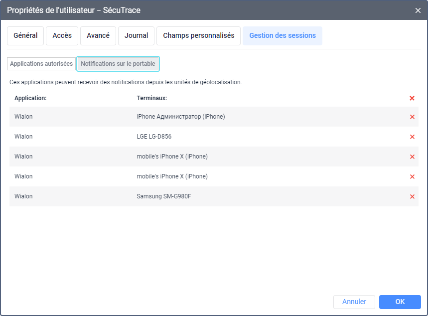 Pour interdire à l’application d’envoyer des notifications portables, supprimez-la de la liste en cliquant sur l’icône
