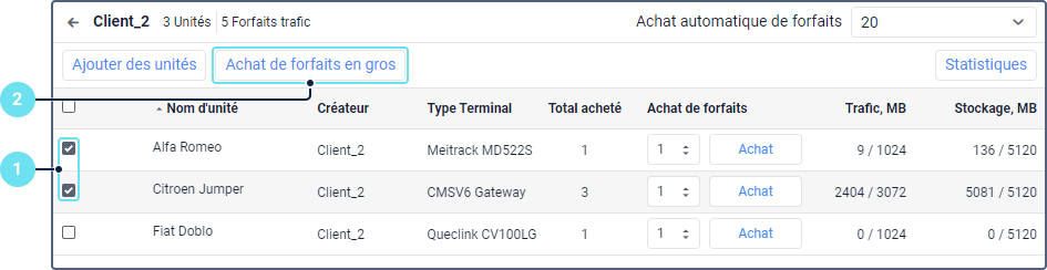 Vous pouvez acheter des forfaits de trafic pour plusieurs unités en même temps. Pour cela, suivez les étapes suivantes :