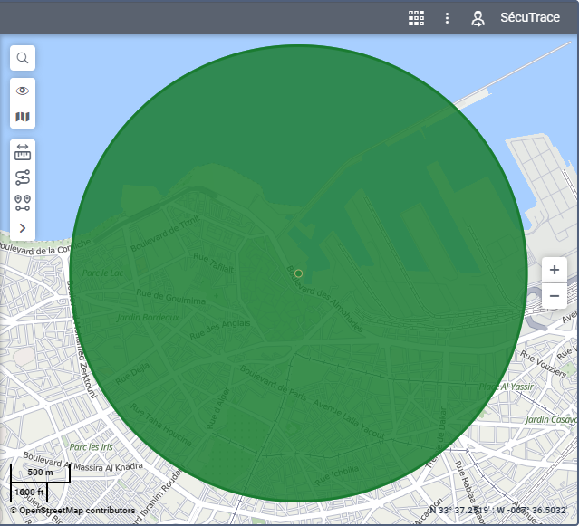 Vous pouvez déplacer une zone circulaire sur la carte en faisant glisser le point central.