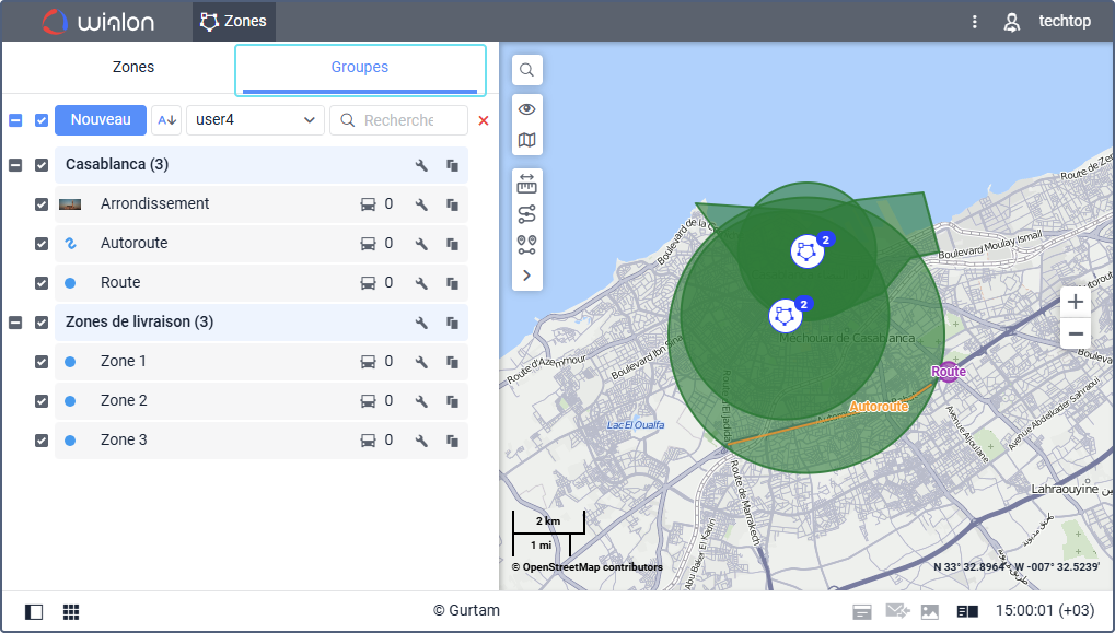 Pour travailler avec des groupes de zones, vous devez disposer des mêmes droits d’accès que pour travailler avec des zones. Les groupes de zones sont utilisés pour combiner les zones selon certains critères. De plus, vous pouvez utiliser des groupes comme filtre dans certains modèles de rapport et dans les notifications de type Zone. Pour ouvrir la liste des groupes, utilisez le commutateur en haut de la zone de travail.