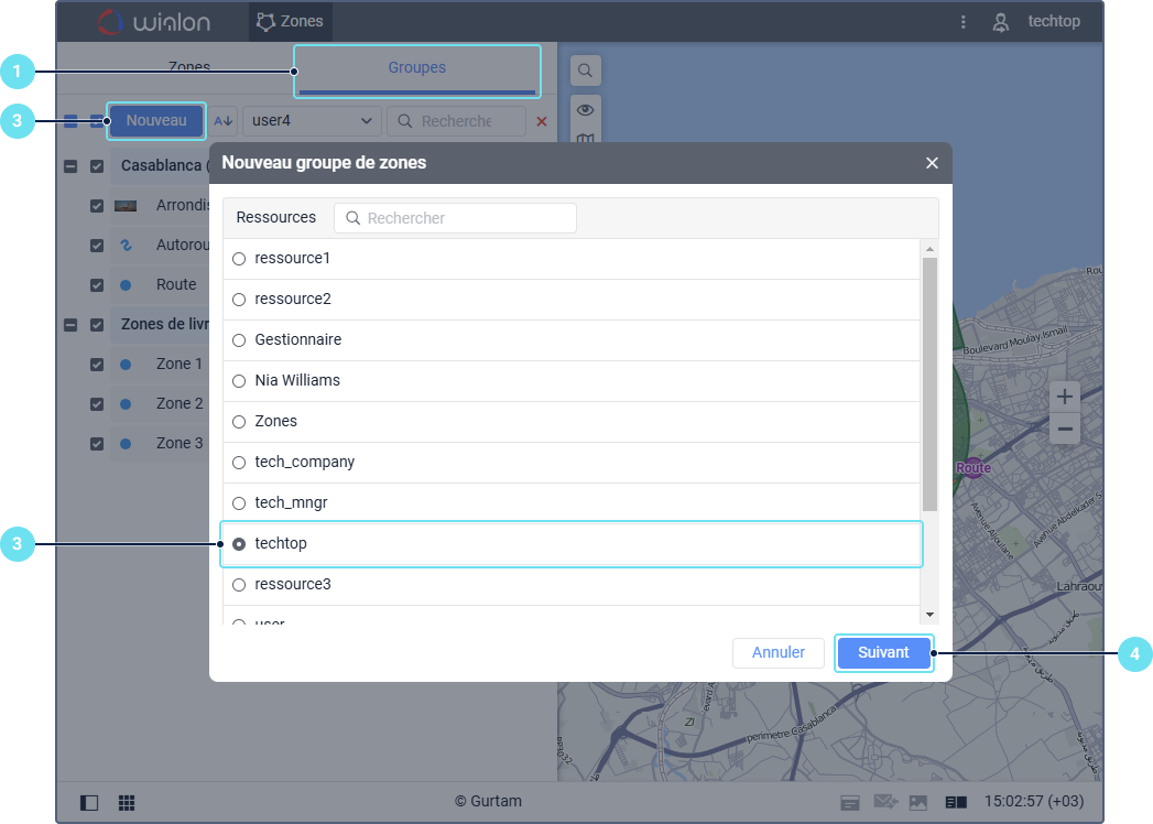 . Pour trouver rapidement le groupe de zones requis, utilisez le filtre dynamique. Vous pouvez également utiliser le filtre par propriété (polygones, lignes, cercles) ou par ressource.