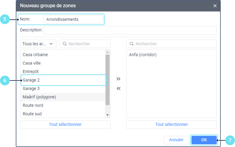 Sélectionnez les zones que vous souhaitez ajouter au groupe. Pour ce faire, sélectionnez les zones requises dans la liste de gauche et déplacez-les vers la liste de droite en cliquant sur l’icône