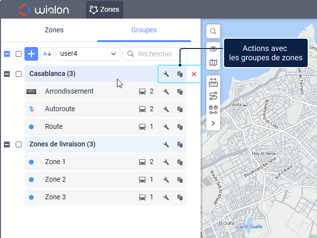 Développez la ligne du groupe pour voir les zones qui lui appartiennent et effectuer des actions . Pour voir toutes les zones du groupe sur la carte, sélectionnez ce groupe dans la liste.