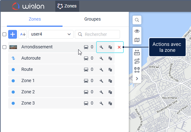- par son nom, si l’option Afficher les noms des zones sur la carte est activée dans les paramètres de l’utilisateur ;