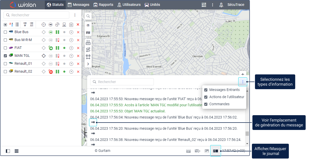 Le journal en temps réel affiche des informations sur la réception de messages d’unités, l’envoi et l’exécution de commandes et les actions de l’utilisateur.