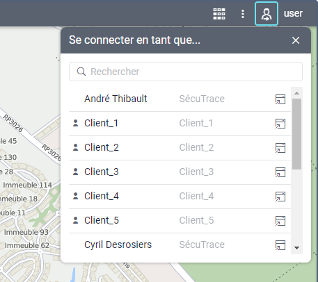 - Dans la liste qui s’ouvre, cliquez sur la ligne de l’utilisateur souhaité pour vous connecter en tant qu’utilisateur dans un onglet existant. Pour le faire dans une nouvelle fenêtre, cliquez sur l’icône