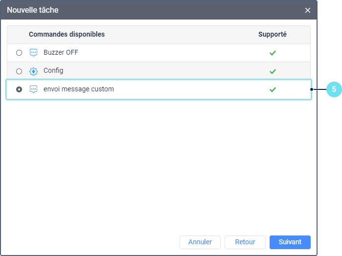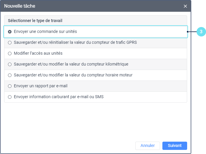 Définissez les paramètres qui dépendent du type de tâche sélectionnée et sont décrits dans la section Types de tâche. Dans le cas de la tâche Envoyer une commande aux unités, cette étape vient après la sélection de l’unité.