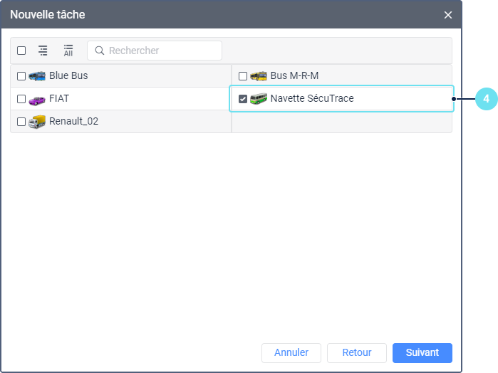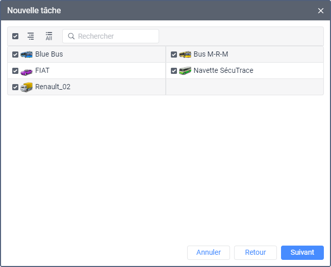 Sélectionnez l’unité ou les unités pour lesquelles vous souhaitez créer la tâche. Dans le cas de la tâche Envoyer une commande, vous pouvez envoyer une commande aux unités.