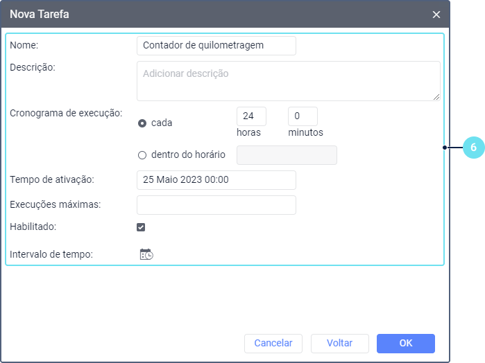 Limitation de temps | Le paramètre qui permet de spécifier l’heure et de sélectionner les jours et/ou les mois pendant lesquels le calendrier d’exécution de la tâche doit être rempli. Par exemple, il peut être rempli uniquement les jours de semaine et pendant les heures de travail, ou uniquement les jours impairs, etc. Par exemple, pour réinitialiser le compteur de trafic GPRS, vous pouvez sélectionner le premier jour de chaque mois, afin que le compteur soit automatiquement réinitialisé au début de chaque mois. Vous pouvez apprendre comment installer une limitation de temps ici. |
