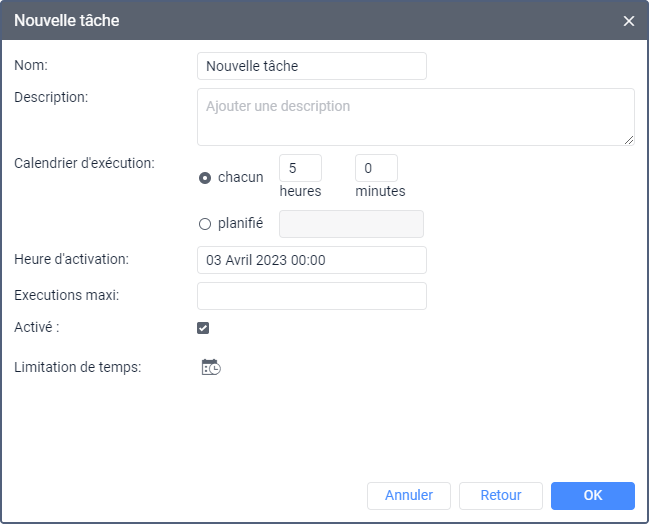 Activé | L’état de la tâche. Si l’option est activée, la tâche est activée après sa création, sinon, désactivée. Vous pouvez activer la tâche désactivée dans la liste de tâches. |