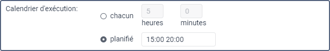 Dans ce cas, la tâche sera effectuée à 15h et à 20h les jours sélectionnés dans le paramètre Limitation de temps, ou tous les jours si la limitation n’est pas paramétrée. |