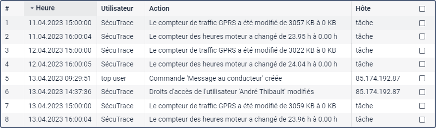 Hôte | L'dresse de l'ordinateur à partir duquel l'utilisateur a effectué la modification. Si la colonne contient le mot notification ou tâche, cela signifie que l'action a été effectuée automatiquement par le système. |