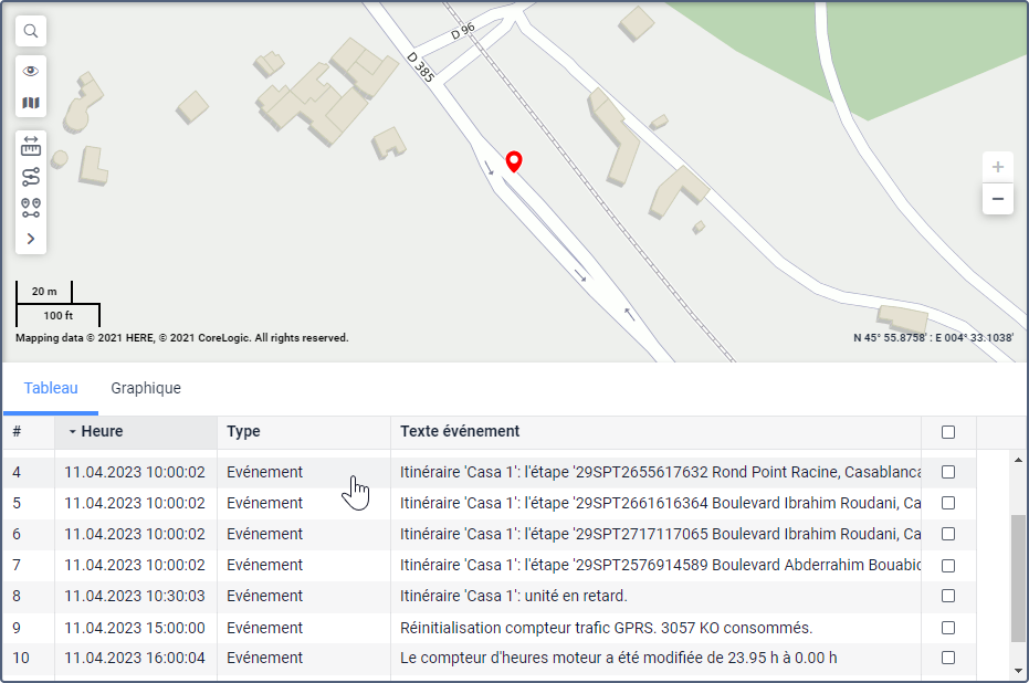 Lors de la demande de messages de type Événements enregistrés, un tableau s’affiche avec la liste des événements qui ont été saisis manuellement ou automatiquement dans l’historique de l’unité. Découvrez les types d’événements et comment les enregistrer ici.
