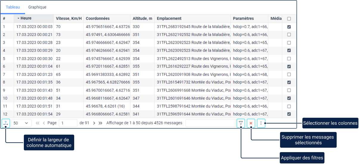 Si vous souhaitez afficher 500 ou 1000 messages sur une page, il est déconseillé d’ajuster automatiquement la largeur des colonnes car cela peut ralentir le chargement des messages, surtout si le nombre de paramètres dans les messages est différent.