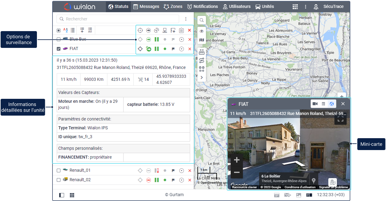 Mini-carte | Pour ouvrir une mini-carte de suivi d'une unité sur la carte et en vidéo, cliquez deux fois sur la ligne de l'unité. En savoir plus sur le focntionnement des mini-fenêtres ici. |