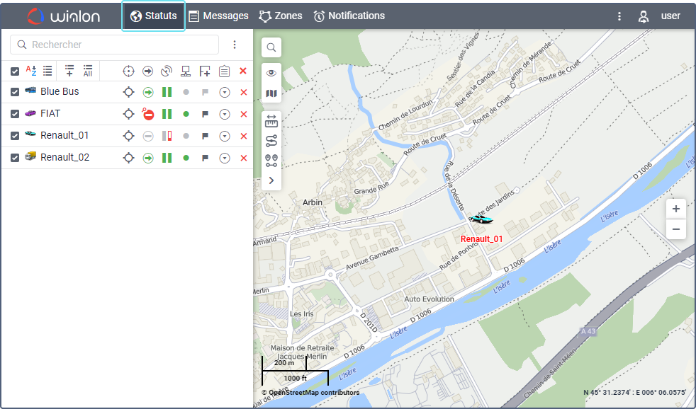 L’onglet Statuts affiche un panneau de statuts qui affiche les unités et la carte où vous pouvez observer leur mouvement en temps réel. Les principales fonctions liées au suivi des unités et au contrôle de leurs paramètres sont disponibles ici.
