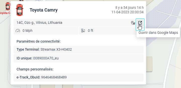 Les informations détaillées peuvent comprendre les éléments suivants : heure du dernier message, localisation de l’unité, présence dans les zones géographiques, distance par rapport à la zone la plus proche, vitesse, altitude, compteurs, satellites, paramètres de connexion, icône de l’unité, valeurs des capteurs, paramètres, conducteurs et remorques affectés, champs personnalisés, périodes de maintenance.