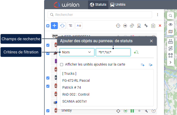 Le filtrage est appliqué à toutes les unités disponibles pour l’utilisateur, de sorte que les unités avec des données à jour sont affichées dans le panneau de statuts et/ou sur la carte, même si elles n’ont pas été précédemment ajoutées à l’onglet Statuts.