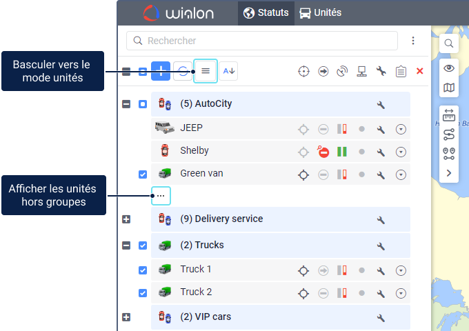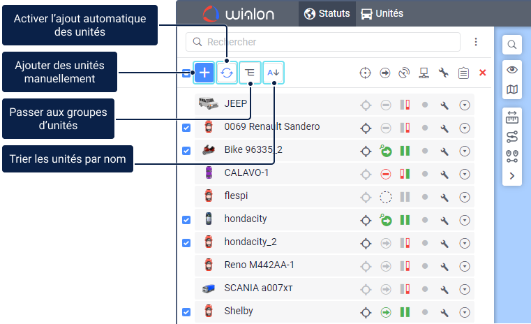 Pour surveiller des unités, elles doivent être placées sur le panneau de statuts. Seules les unités du panneau de statuts peuvent être affichées sur la carte et utilisées dans diverses tâches de surveillance : effectuer des tâches et des notifications, générer des rapports, affecter des conducteurs et des remorques, voir les messages, les tracés, rechercher les objets les plus proches, etc.
