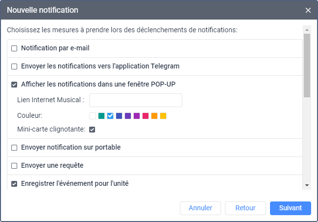 Sélectionnez une ou plusieurs actions à effectuer après le déclenchement de la notification. Il peut s’agir d’envoyer la notification de différentes manières, d’enregistrer un événement ou d’effectuer une action avec des objets de système.