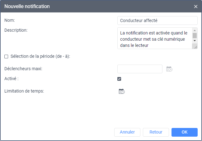 Spécifiez le nom de la notification, sous lequel elle sera affichée dans la liste, et les paramètres liés à l’heure et à la durée de son déclenchement. Cliquez sur OK pour enregistrer les modifications.