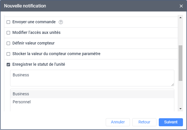 Cette action vous permet d’enregistrer le statut de l’unité : Business ou Personal. Pour ce faire, vous devez disposer du droit d’accès Gérer les événements pour l’unité. Par exemple, lorsque l’unité visite une certaine zone, le statut de l’unité peut être changé de personal à business ou vice versa.