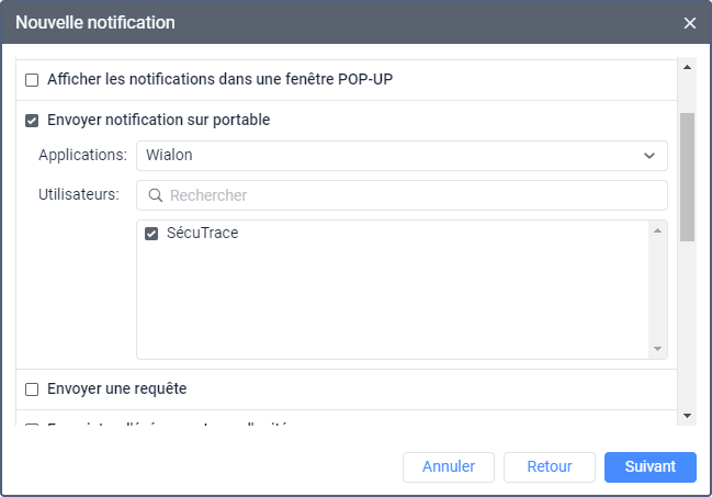 Cette action permet de configurer l’envoi de notifications sur portables. L’action est disponible si le service Notifications sur le portable est activé dans les propriétés du compte de l’utilisateur.