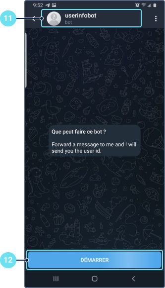 11. À l’aide de la recherche, recherchez et ouvrez le bot nommé userinfobot userinfobot.