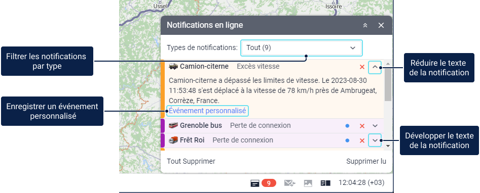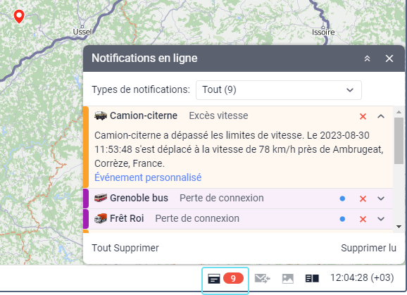 Quand vous cliquez sur le nom de la notification, la carte est centrée sur l’endroit où l’événement s’est passé. Quand vous cliquez sur le nom de l’unité, la carte est centrée sur sa dernière position. L’unité est également ajoutée au pannneau de statuts dans l’onglet Statuts et sur la carte.