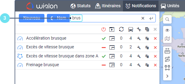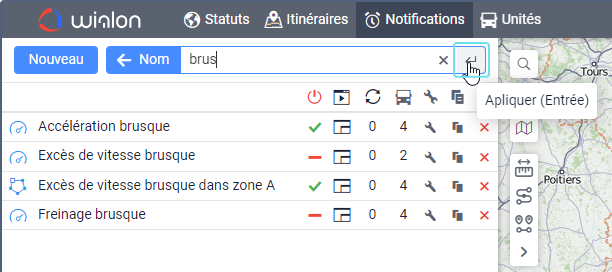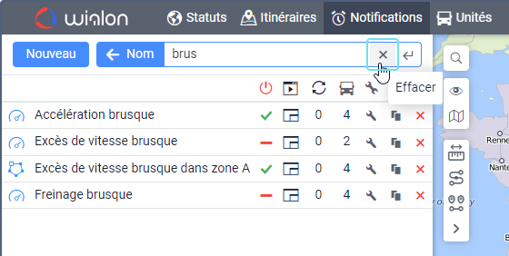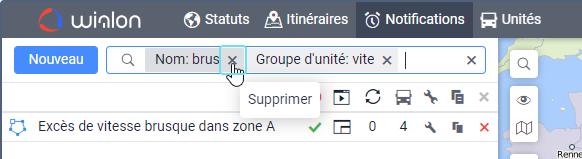 Par exemple, si vous sélectionnez le critère Nom, la liste affichera toutes les notifications dont le nom contient les caractères vite.