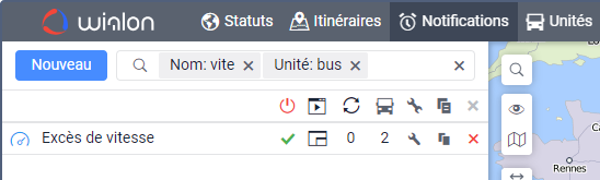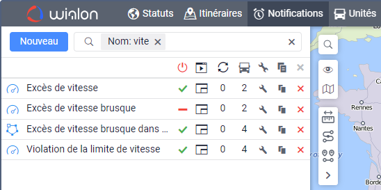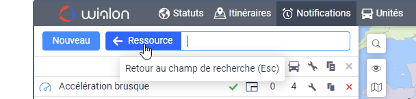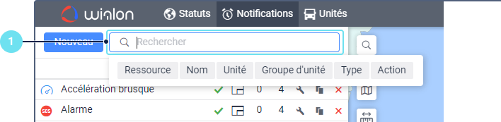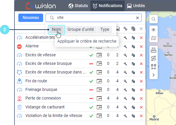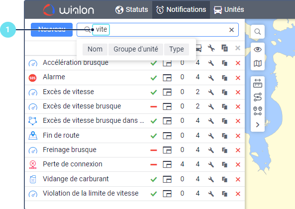 Tous les critères de recherche qui correspondent à votre requête sont affichés sous le champ. Par exemple, si vous saisissez vite et que vous disposez de notifications portant le nom Excès de vitesse, de notifications de type Vitesse et de notifications créés pour le groupe d’unités Véhicules à basse vitesse, les critères Nom, Type de notification et Groupe d’unités s’afficheront sous votre requête. - Sélectionnez un critère de vitesse.
