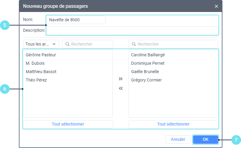 Sélectionnez les passagers qui doivent appartenir au groupe. Pour ce faire, sélectionnez les passagers requis dans la liste de gauche et déplacez-les vers la liste de droite en cliquant sur l’icône