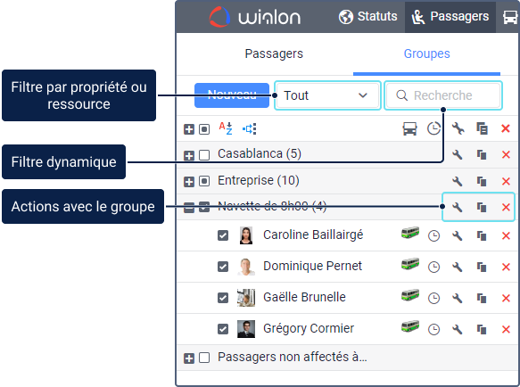 . Pour trouver rapidement le groupe de passagers requis, utilisez le filtre dynamique ou le filtre par propriété (passagers affectés ou non affectés) ou par ressource.