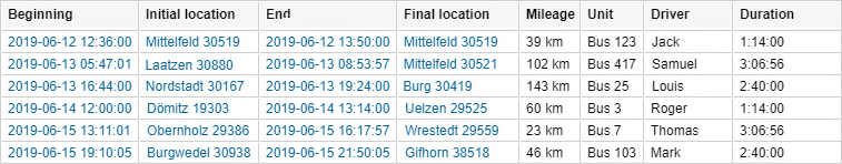 Le tableau Liens peut inclure l’heure et le lieu où les passagers montent/descendent d’un véhicule, le nom de l’unité utilisée par les passagers, la durée d’un voyage, etc.