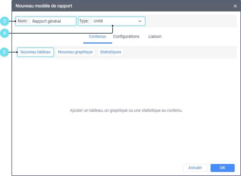 Dans l’onglet Сontenus cliquez sur Nouveau tableau pour ajouter un tableau. Il présentera les principales données du rapport.