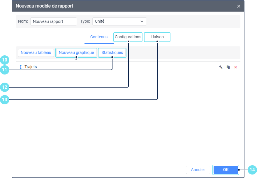 Ajoutez la statistique, si vous avez besoin d’informations récapitulatives sur le rapport lui-même (intervalle de rapport, durée d’exécution, etc.) ou d’indicateurs récapitulatifs pour le kilométrage, les heures moteur, la consommation de carburant, etc.