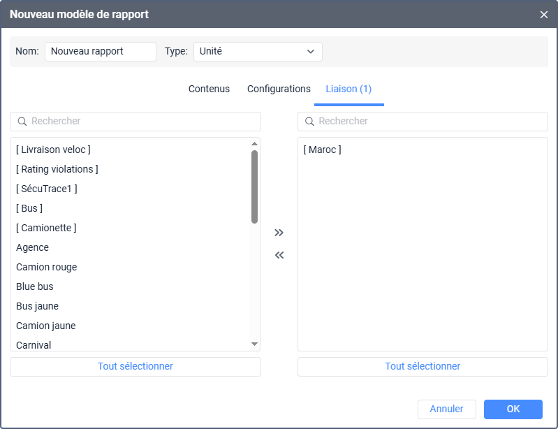 Selon son type, un modèle de rapport peut être lié à des objets système spécifiques et à leurs groupes (unités, conducteurs, remorques et passagers). La liaison vous permet de restreindre la liste des éléments pour lesquels le rapport est exécuté.