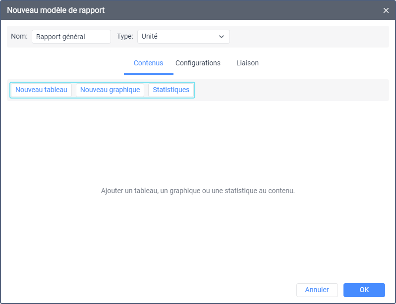 Dans l’onglet Contenus, vous pouvez ajouter des tableaux, des graphiques ou des statistiques au modèle de rapport.