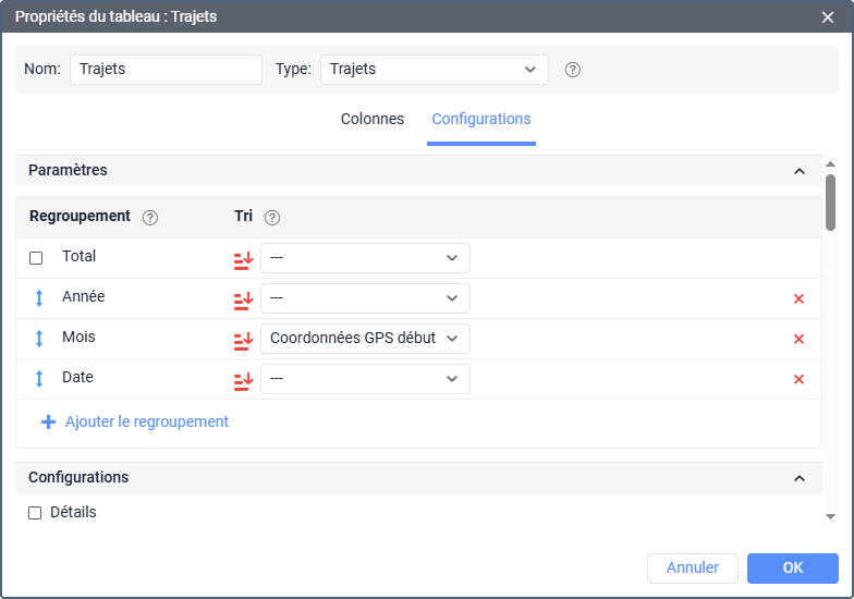 Lors du regroupement des données du tableau, il est judicieux d’utiliser la colonne Durée totale qui, contrairement à la colonne Durée, indique non pas la somme des intervalles (par exemple, la durée totale de tous les déplacements), mais le temps écoulé entre le début du premier intervalle et la fin du dernier. Cela permet, par exemple, de calculer la durée totale d’une journée de travail (pratique pour les feuilles de route).