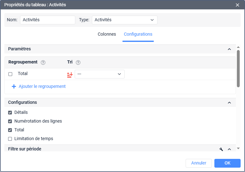 Nous pouvons ajouter des détails dans le rapport (en cochant la case correspondante dans les paramètres du tableau), suggérés ci-dessous comme exemple d’utilisation du regroupement et du tri. Puisque dans cet exemple nous avons déjà un regroupement par années, mois et dates, les détails nous permettront d’étendre le niveau d’imbrication juste avant l’heure de l’événement (heures, minutes, secondes).