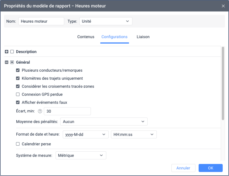 Dans la section Général, vous pouvez configurer le format de la date et de l’heure, sélectionner le système de mesure et le séparateur de milliers et, selon le type de rapport, activer d’autres options décrites ci-dessous.